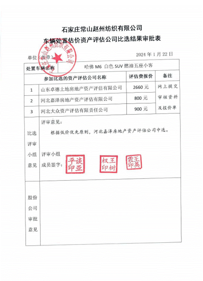 石家庄常山赵州纺织有限公司,因车辆处置拟对本公司所属白色SUV轿车进行价格评估,根据规定流程对报名参加评估的单位进行审核比选,现将比选结果公告如下: